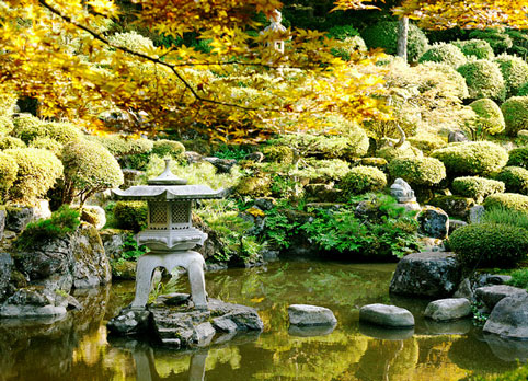 花園常常將山石構(gòu)成石景,配以石燈籠和植物組景等。你可以將這樣一個(gè)花園理解為河流中的巖石,或傳說(shuō)中的神秘小島,但若僅從美學(xué)角度考慮亦堪稱(chēng)絕作;它對(duì)組群、平衡、運(yùn)動(dòng)和韻律等充分權(quán)衡,其總體布局相對(duì)協(xié)調(diào),以至于稍微移動(dòng)某一塊石便會(huì)破壞該庭園的整體效果。